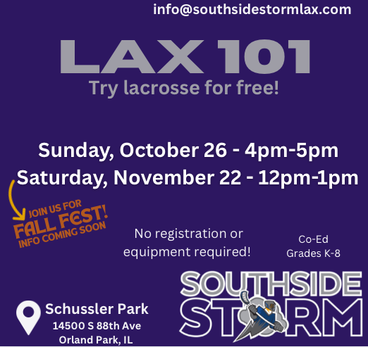 Come out and join us for Southside Storm Fall Fest on Saturday, November 22 - a fun day for players, families and friends! The day will feature LAX101 for prospective players, our Turkey Bowl for current players, plus games, raffles, and be sure to grab a bite at the S&T Pizza Tent! All LAX101 and Turkey Bowl players will receive a free Storm winter hat! Don’t forget to register for the Turkey Bowl by 11/18. No registration is needed for LAX101 - just show up and have fun! Storm alumni are encouraged to stop by to say hello!